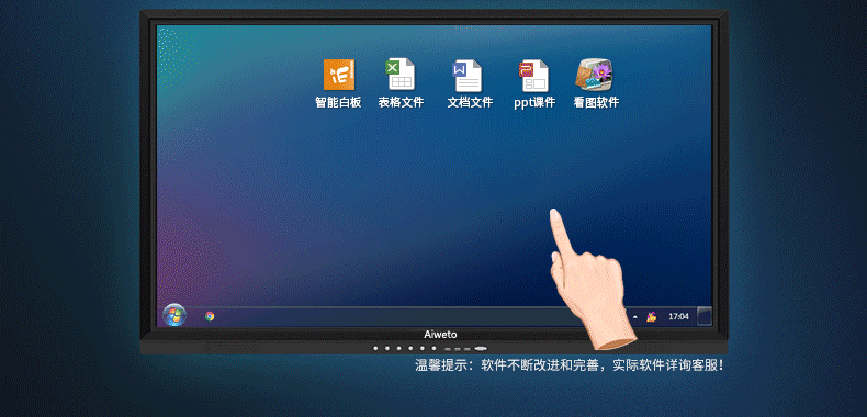 AW系列-多媒體教學(xué)一體機(jī),高清大屏顯示,壁掛支架多種使用方式,人性化機(jī)型設(shè)計,立式與掛式兩種使用方法可交替使用,避免使用環(huán)境發(fā)生變化時產(chǎn)生的資源浪費問題采用LED背光源長壽命,低功耗,環(huán)保節(jié)能。智能電子白板,各種文件一鍵加載,多點觸控智能電子白板適用于各種商務(wù)會議,支持手寫批注,兼容日常office辦公軟件,本地、U盤、網(wǎng)盤、局域網(wǎng)數(shù)據(jù)輕松駕馭。書寫流暢,減少視覺誤差,高端企業(yè)必備,多重主題背景,筆形色彩,任意選擇。高端配置 讓運行速度,完美兼容WIN7,WIN8 隨意切換。