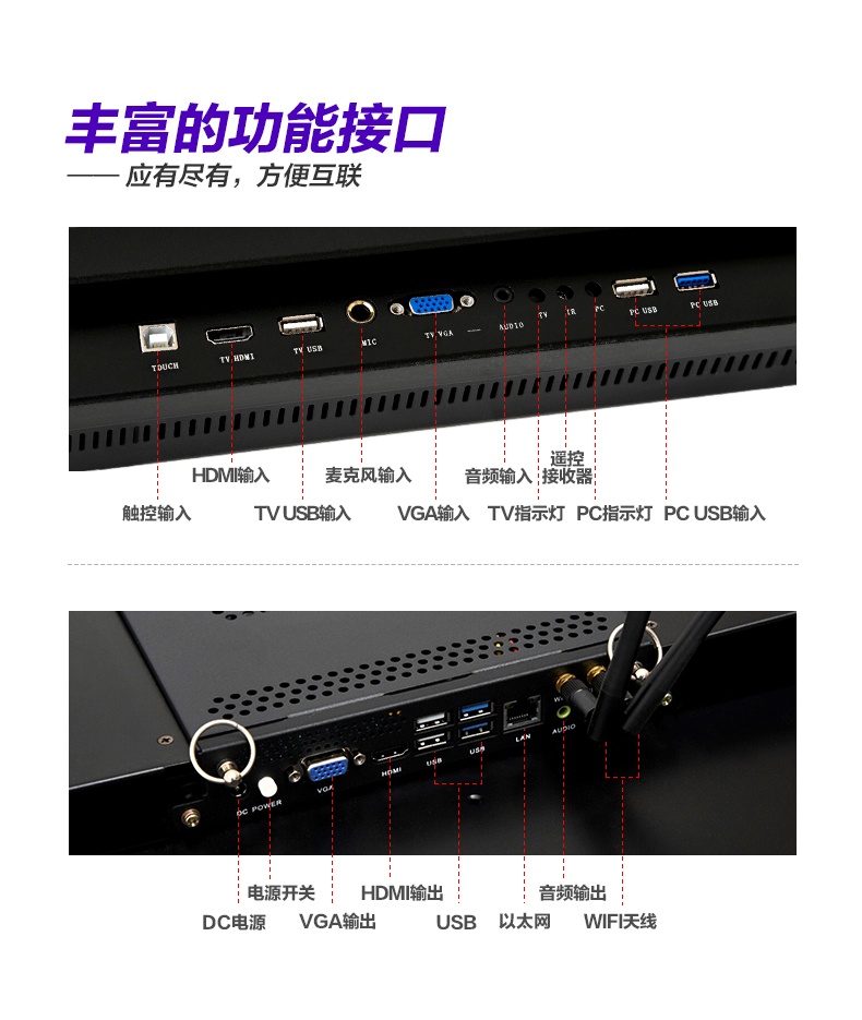 HDMI(外置)×2,HDMI(內(nèi)置)×1,VGA×1,VGA Audio×1,AV×2,YPbPr×1,TV×1,USB2.0×2,USB3.0×1,外置觸摸屏USB2.0×1,SD卡×1,RJ45網(wǎng)口×1 |