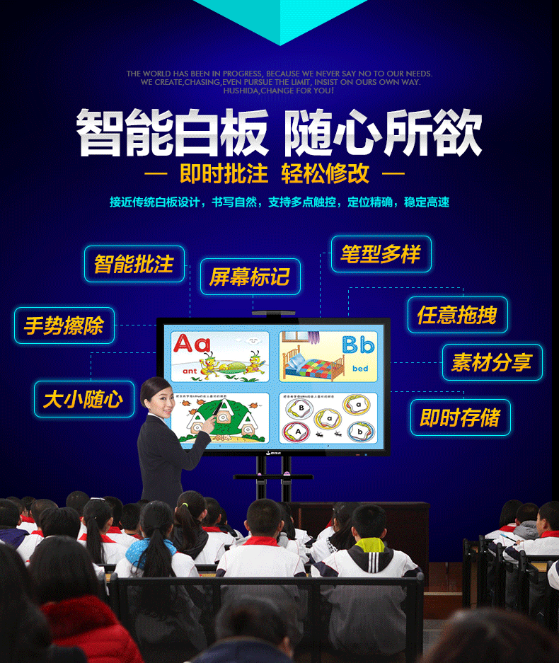 AW系列-多媒體教學一體機,高清大屏顯示,壁掛支架多種使用方式,人性化機型設計,立式與掛式兩種使用方法可交替使用,避免使用環(huán)境發(fā)生變化時產生的資源浪費問題采用LED背光源長壽命,低功耗,環(huán)保節(jié)能。智能電子白板,各種文件一鍵加載,多點觸控智能電子白板適用于各種商務會議,支持手寫批注,兼容日常office辦公軟件,本地、U盤、網盤、局域網數據輕松駕馭。書寫流暢,減少視覺誤差,高端企業(yè)必備,多重主題背景,筆形色彩,任意選擇。高端配置 讓運行速度,完美兼容WIN7,WIN8 隨意切換。