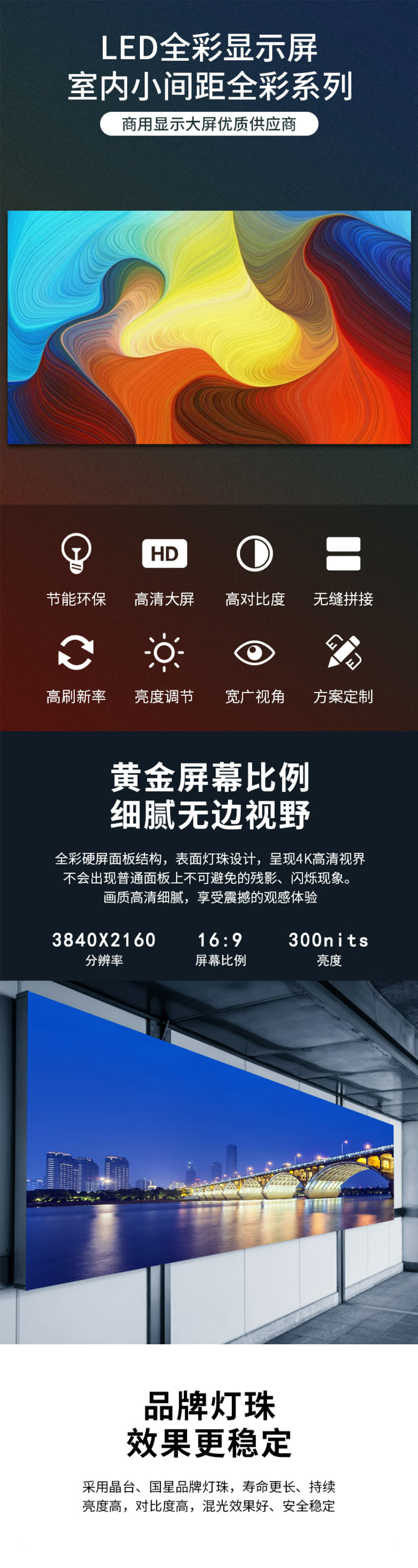 P1.86室內LED顯示屏產品特點:室內全彩 LED顯示屏是室內全彩LED顯示屏系列產品中清晰度最高的產品,利用高清顯示技術,采用SMD表貼三合一工藝生產,可播放高清視頻文件,屬于高端LED顯示屏產品系列,為各類會議室、禮堂、電影院、宴會廳、政企大堂、高端辦公室,量身定制高精度視頻墻,形象墻。